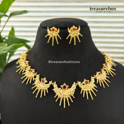 A graceful crescent-shaped necklace that reflects timeless tradition and cultural charm. This handcrafted piece is designed to bring elegance and radiance to your festive and bridal looks.